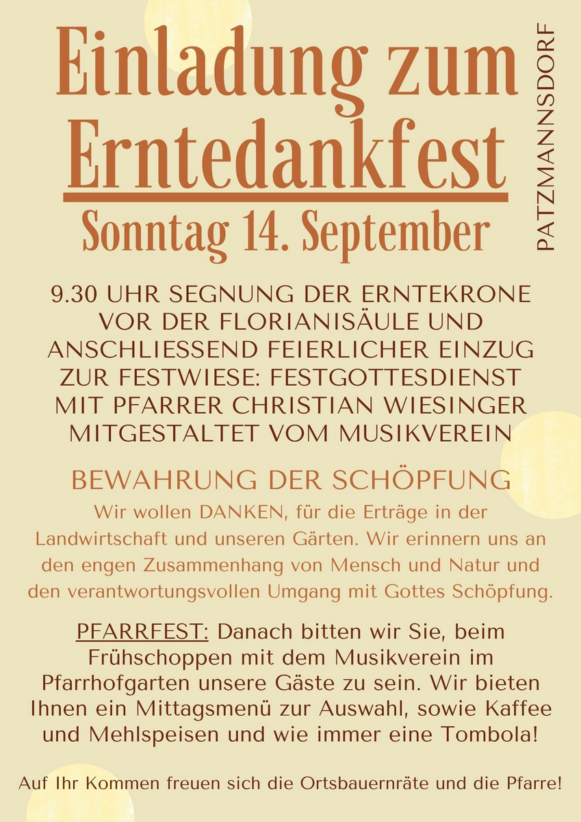 11.00 Uhr Pfarrgemeinderat und Ortsbauernrat laden zum Pfarrfest mit Frühschoppen des Musikverein Patzmannsdorf in den Pfarrgarten ein. Es gibt wieder ein reichhaltiges Angebot zum Mittagessen, Kaffee und Kuchen, sowie Patzmannsdorfer Weine und eine Tombola