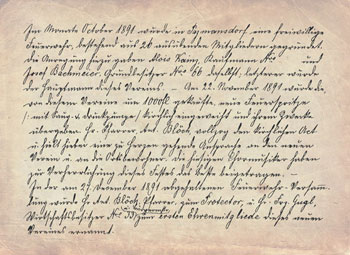 Am 22. November 1891 wird die, von diesem Verein um 1000 fl [ Gulden; 1) ] gekaufte Feuerwehrspritze (Saug- u. Druckpumpe), kirchlich eingeweiht und ihrem Zweck übergeben. Herr Pfarrer Anton Blöch vollzieht den kirchlichen Akt und hält hierbei eine sehr passende Ansprache an die Bevölkerung. In der am 27. November 1891 abgehaltenen Feuerwehrsammlung wird Herr Pfarrer Anton Blöch zum Protector und Herr Franz Gugl, Wirtschaftsbesitzer und Bürgermeister Nr. 33 zum ersten Ehrenmitglied dieses Vereins ernannt.
