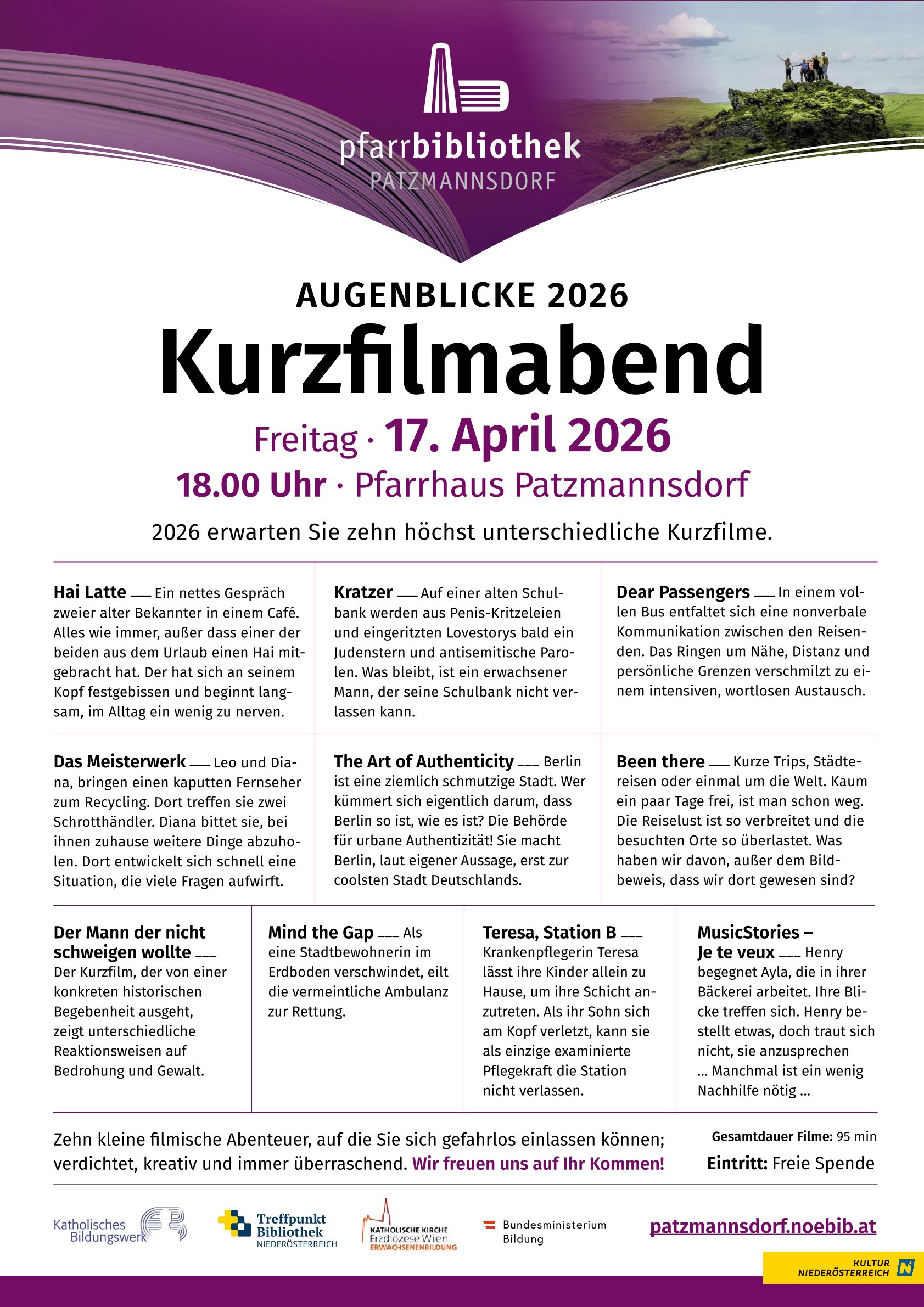 2026 erwarten Sie zehn höchst unterschiedliche Kurzfilme. Zehn kleine Abenteuer, auf die Sie sich gefahrlos einlassen können; verdichtet, kreativ und immer überraschend. Sie zeigen neue Blickwinkel, erzähhlen von anderen Lebensrealitäten und reflektieren unsere Zeit. Ob leise oder laut, poetisch oder provokant: In wenigen Minuten öffnen sie Räume zum Staunen, Lachen, Nachdenken. Die Vielfalt der Formate macht den Kurzfilm zum idealen Medium, um sich neugierig, kritisch und offen mit unseren Emotionen, Werten und Lebensrealitäten auseinanderzusetzen; Kurzfilme erleben mit allen Sinnen und gemeinsam mit anderen Menschen.