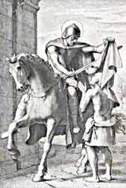 Eines Tages, als Martin nichts außer Waffen und dem einfachen Soldatenmantel bei sich trug, begegnete er mitten im Winter, der von so außergewöhnlicher Härte war, dass viele erfroren, am Stadttor von Amiens einem nackten Armen. Dieser flehte die Vorbeigehenden um Erbarmen an. Doch alle liefen an dem Elenden vorüber. Da erkannte Martin, von Gott erfüllt, dass der Arme, dem die anderen keine Barmherzigkeit schenkten, für ihn da sei.
